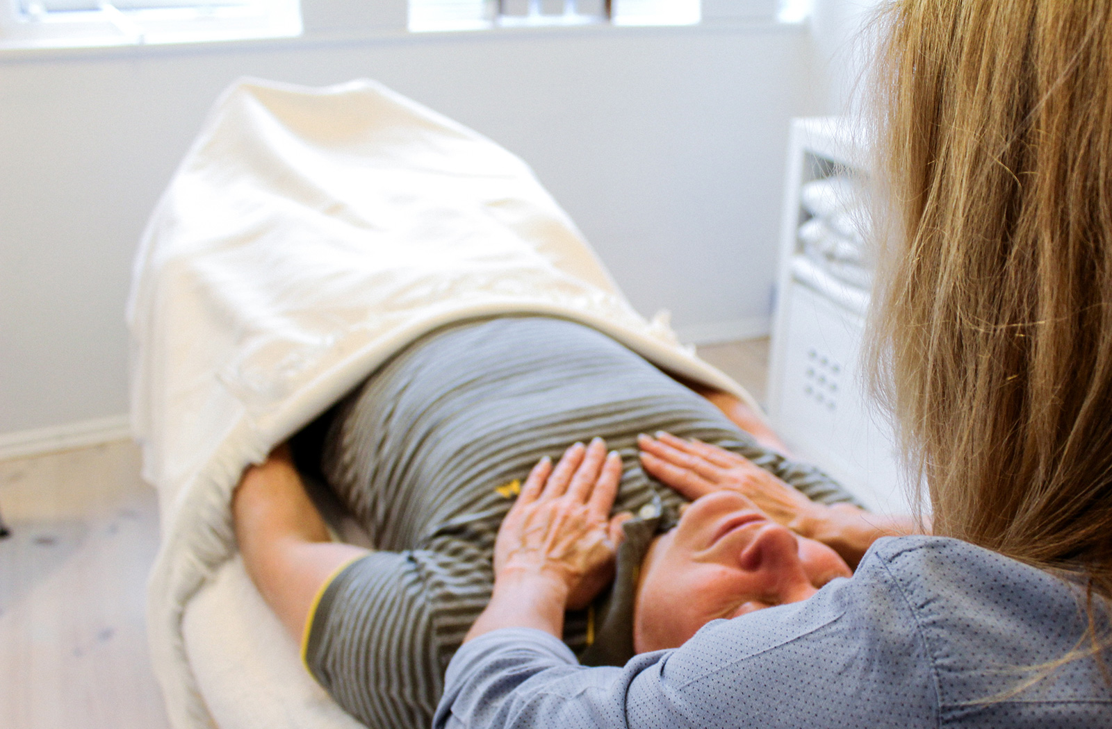 Jeg vil så nænsomt placere mine hænder forskellige steder på kroppen oven på tæppet. De enkelte positioner af håndspålæggelse holdes så længe, der er behov for det.